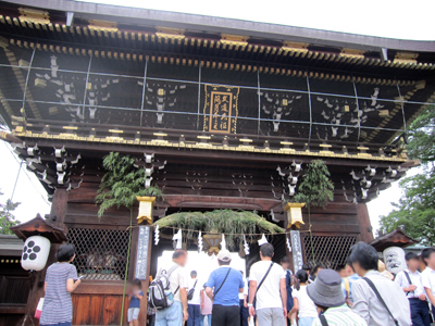 この大茅の輪は参拝の方々がこの茅を少しもらって、小さな輪を作ってお守りにするために持って帰ります。遅い時間に行くと、楼門の大茅の輪はもうその原型をとどめていません。